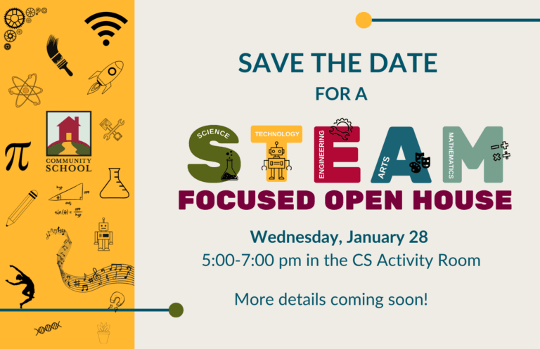 Join us as a family any time between 5-7 p.m. on Wednesday, January 28 to enjoy hands-on STEAM activities designed by our middle school students. It’s a fun and engaging evening for kids, while parents get the chance to see how Community School brings education to life and empowers students through project-based learning. More details on the event and registration coming soon!